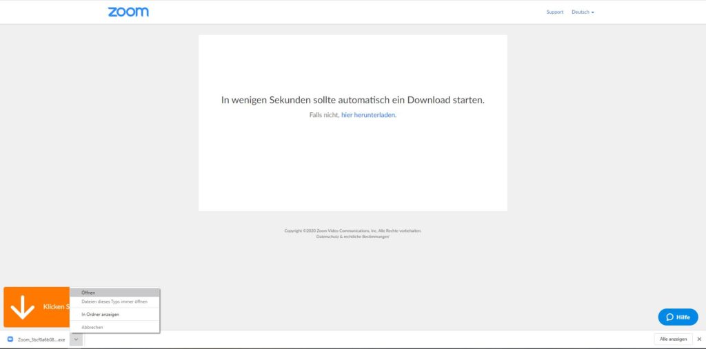Nutzt du einen PC, Laptop oder MacBook öffnet sich anschließend dein Browser und du wirst aufgefordert dir ZOOM herunterzuladen. Bitte folge den Anweisungen, lade dir die Zoom.exe herunter und öffne diese anschließend.